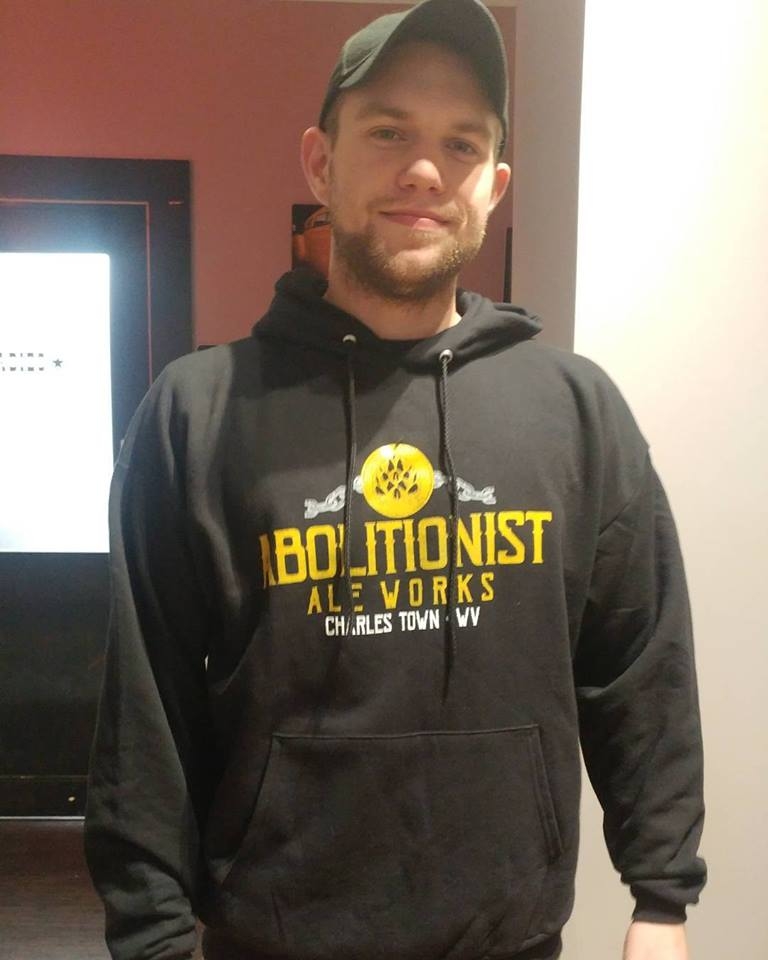 Black pullover hoodie with Abolitionist Ale Works gold, silver and white logo with Charles Town, WV Print in white