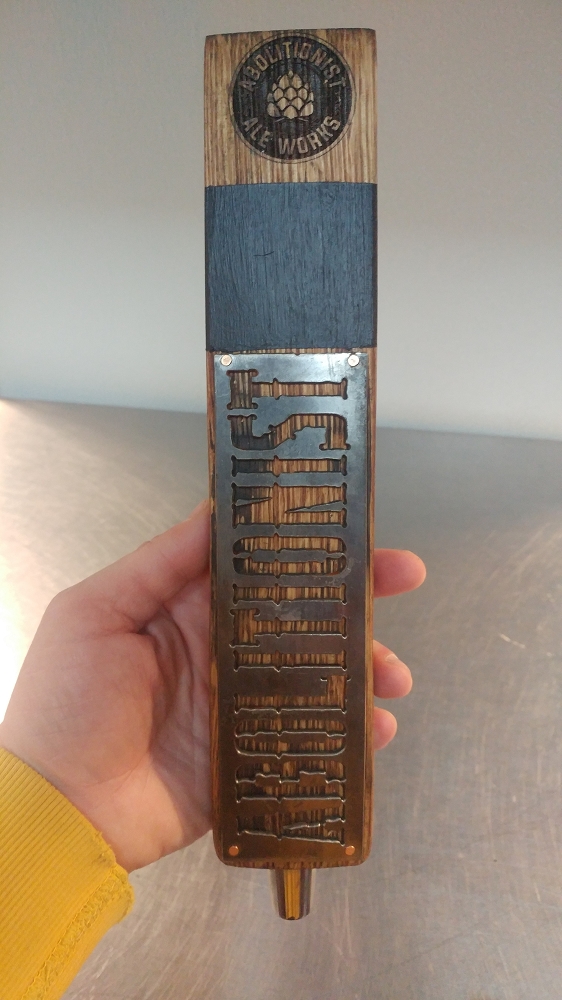 Handmade Abolitionist Ale Works tap handle, made from real oak barrel staves. Includes metal "Abolitionist" as well as our alternate hop logo printed on top. Includes a chalk board area to write in different beer names.