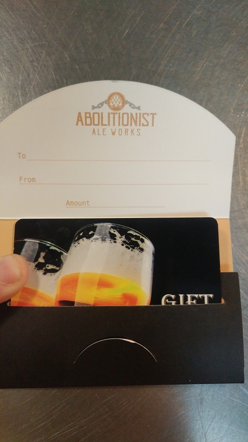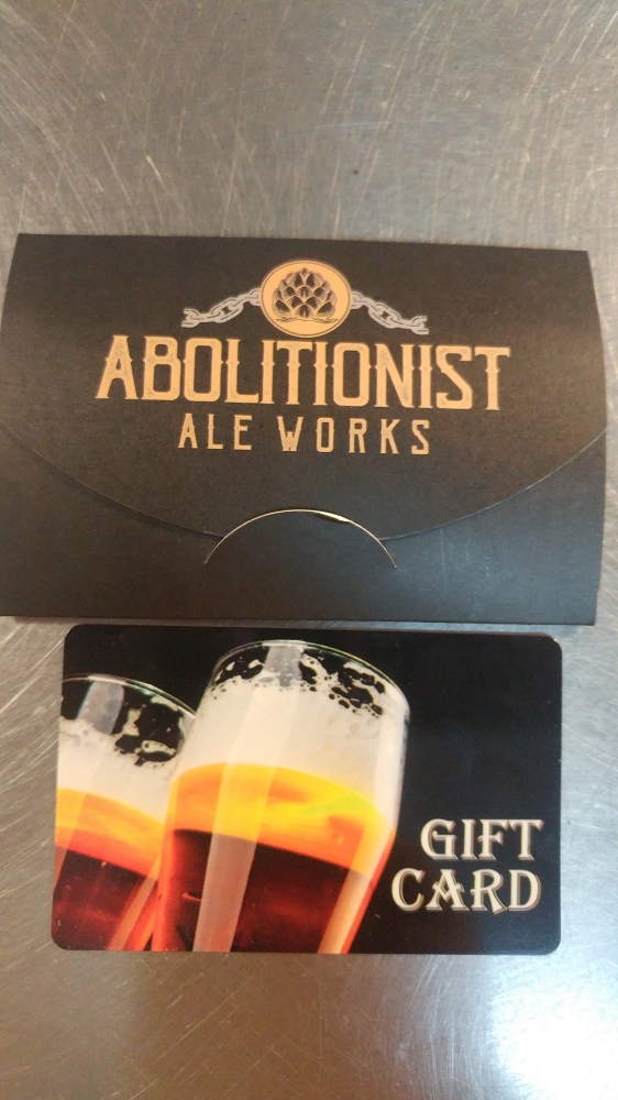 hard Abolitionist Ale Works Gift Cards, comes with logo gift envelope. Please call or email to purchase different values of gift cards. Minimum $25.00
