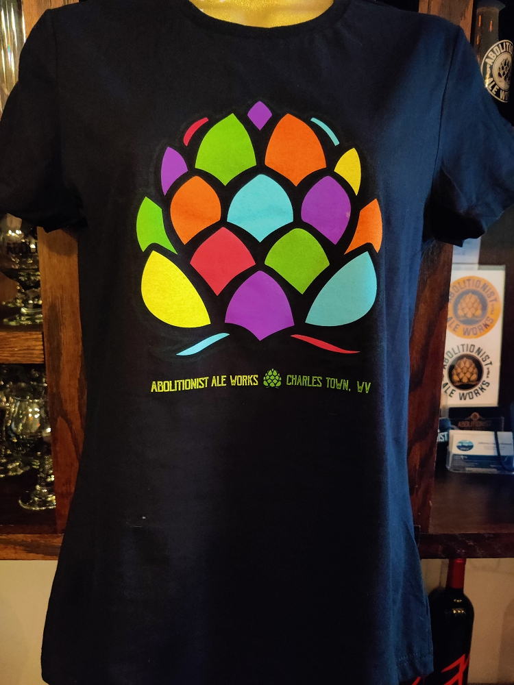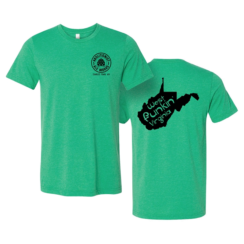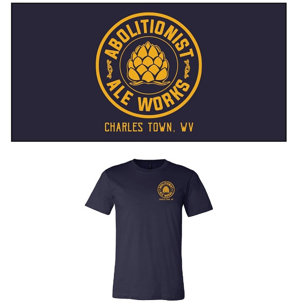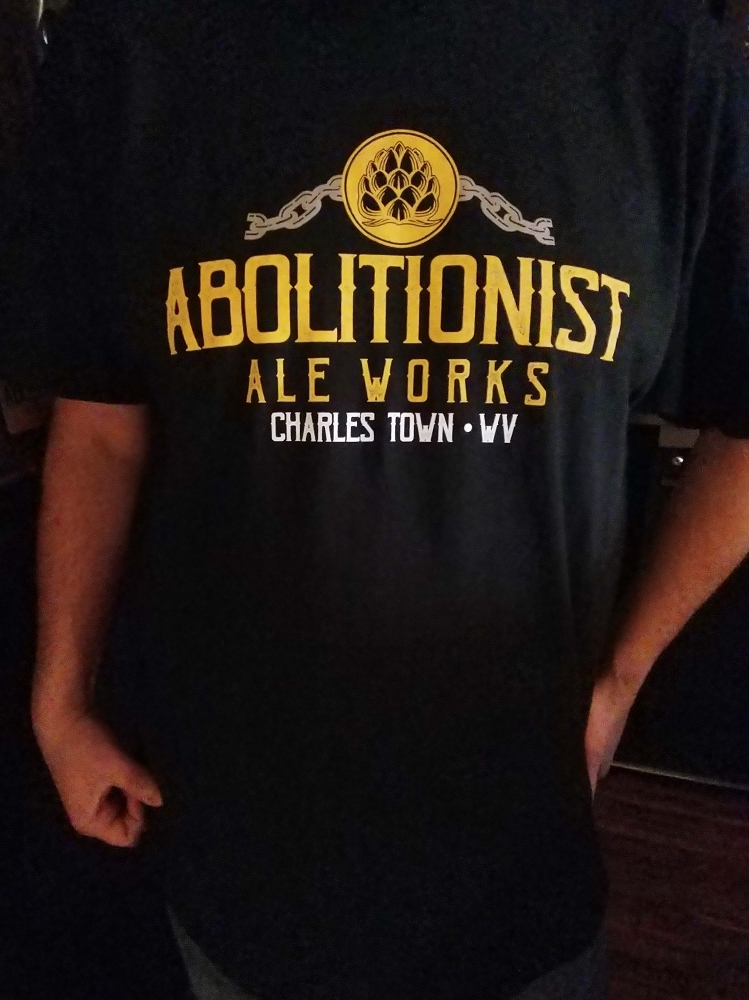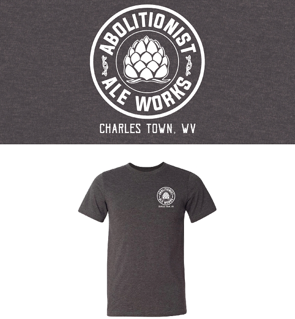 Circle Abolitionist Ale Works logo on front chest, large WV Logo on rear