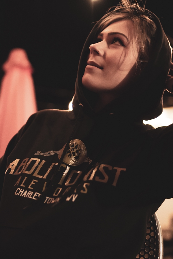 Black pullover hoodie with Abolitionist Ale Works gold, silver and white logo with Charles Town, WV Print in white