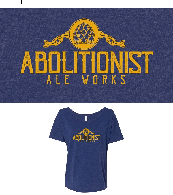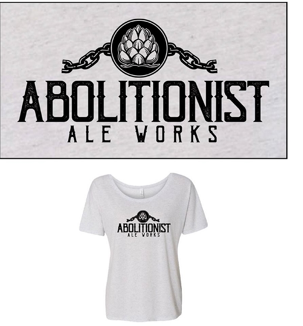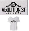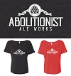 Circle Abolitionist Ale Works logo on front chest, large WFV state logo on rear