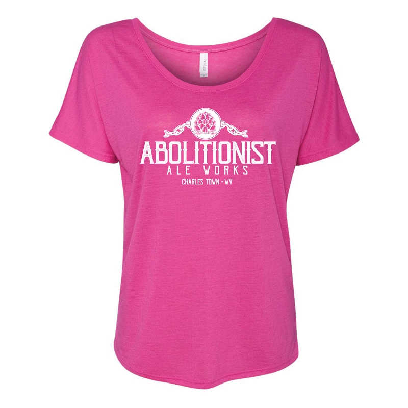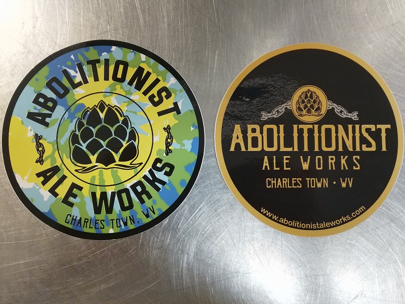 Circle Abolitionist Ale Works logo on front chest, large WV Logo on rear
